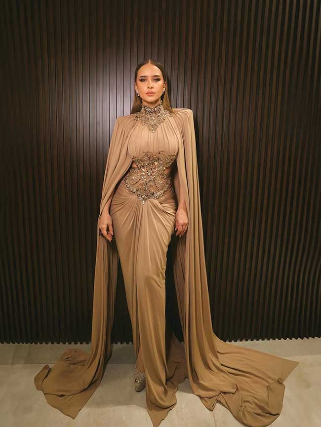 Zuhair Murad imzalı couture elbisesiyle lavanta halıda asil bir görünüm sergileyen Nelly Karim, zarafetiyle olduğu kadar romantik havasıyla da kalpleri fethetti.