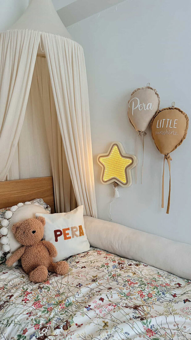 Tasarım dilimizi sade, zamansız ve duygusal olarak tanımlayabiliriz. Doğal malzemeler, yumuşak pastel tonlar ve minimal formlar kullanarak hem çocuklara hitap eden hem de ebeveynlerin dekorasyon anlayışıyla uyum sağlayan ürünler tasarlıyoruz. Bizim için bir ürün sadece işlevsel değil, aynı zamanda odanın bir parçası, hatta bir duvar aksesuarı gibi hissettirmeli.