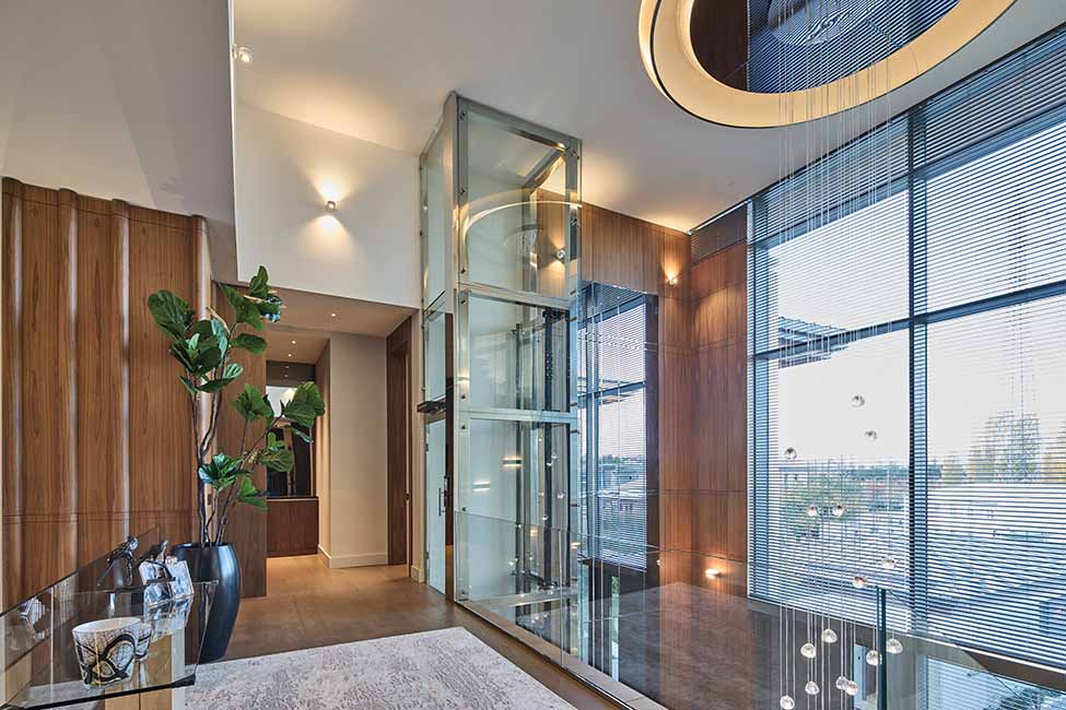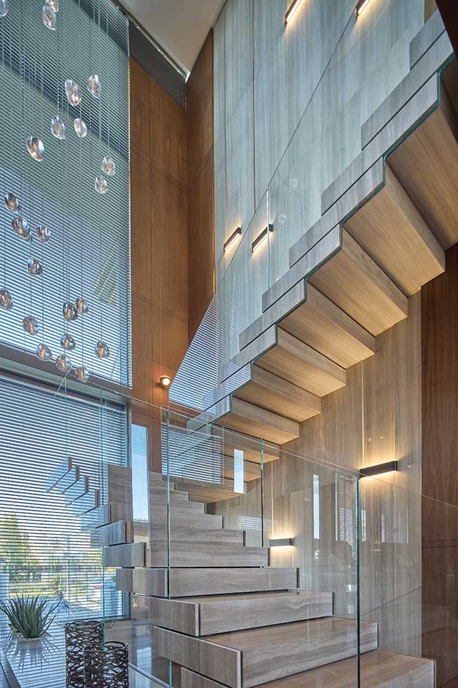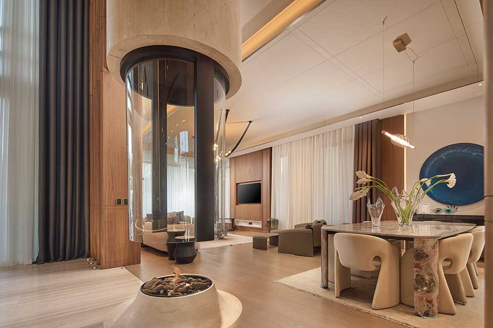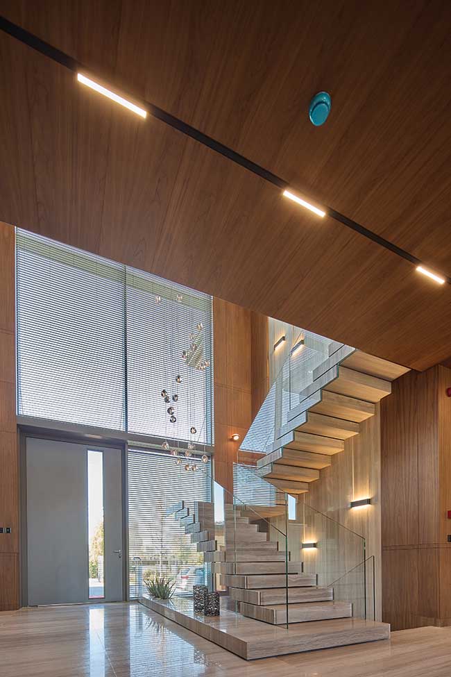 İlk adımda kullanıcıyı karşılayan cam asansör ve heykelsi merdiven, girişte dramatik bir karşılama yaratırken; yukarı katlara uzanan geniş galeri boşlukları, evin tümünde süreklilik kazanan dikey bir mekânsal deneyim oluşturuyor. Bu galeriler, doğal ışığın yapı boyunca süzülerek akmasını sağlıyor; aynı zamanda farklı yaşam alanları arasında güçlü bir görsel bağ kuruyor. Böylece evin içindeki mekânlar birbirine yalnızca dolaşımla değil, duyumsal ve görsel bir süreklilikle bağlanıyor.