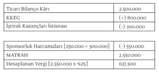 - Sponsorluk harcamaları ticari kârın tespitinde indirim konusu yapılmış ve sonra da KKEG satırına eklenmiştir.