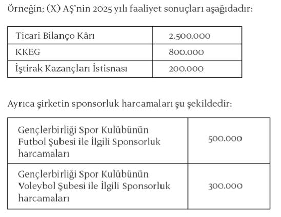Örneğin; (X) AŞ, Gençlerbirliği Spor Kulübüne 2025 yılında 1.000.000 TL nakdi bağışta bulunmuştur. Şirketin 2025 yılı kurumlar vergisi matrahı ise 15.000.000 TL’dir.