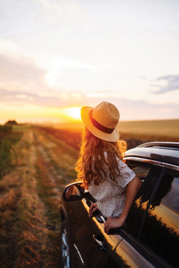 Woman is resting and enjoying sunset in car. Summer trip. Lifestyle, travel, tourism, active life.