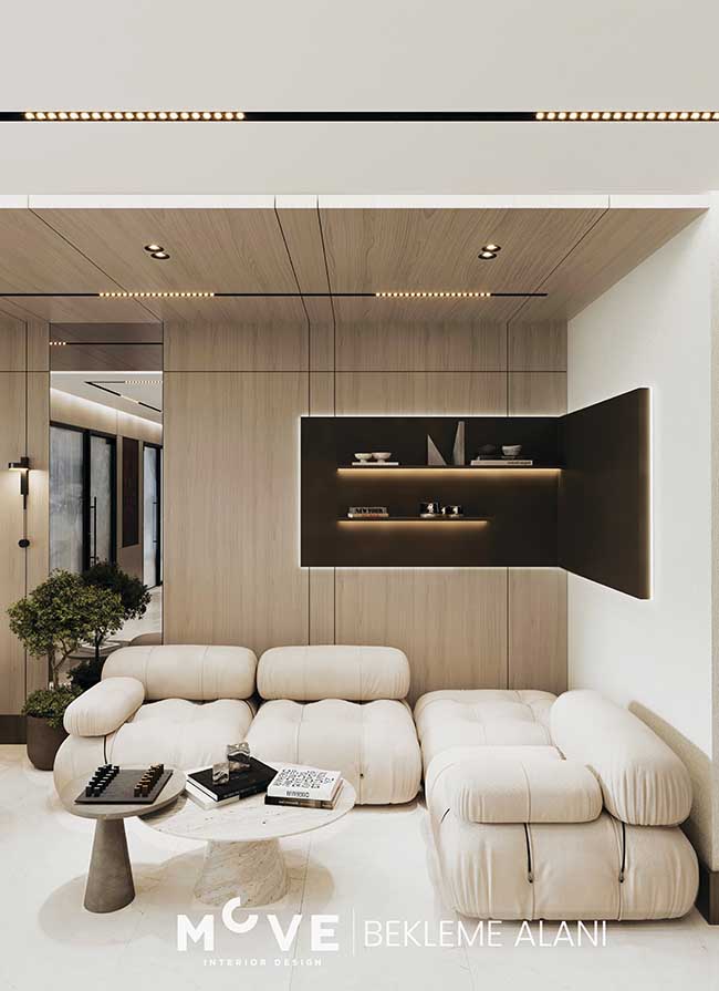 Resepsiyon alanında yer alan özel üretim, yumuşak hatlara sahip karşılama bankosu; işlevselliğinin ötesinde, MOVE İç Mimarlık’ın imza estetik çizgisini temsil ediyor. Bankonun hemen ardında yer alan niş raf sistemi, hem depolama çözümü hem de görsel bir katman olarak mekâna katkı sağlıyor. Bekleme alanı, geleneksel klinik anlayışından uzak, daha çok bir sanat galerisi veya bir otel lounge’ını andırıyor. Düşük profilli koltuklar, heykelsi yan sehpalar ve bitkisel dokularla desteklenen kompozisyon, kullanıcıya sadece fiziksel değil; duygusal bir konfor da sunuyor.