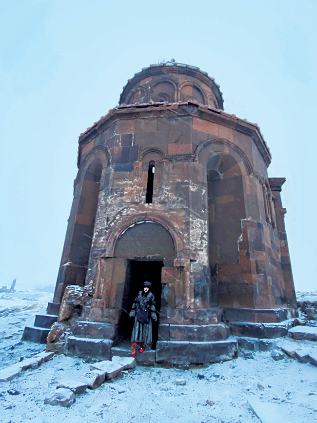 Alandan direkt Ani harabelerine geçtik. Vaktimiz azdı. Hava kararmadan bu turu bitirmeliydik. Her yer beyazın bin bir tonu karla kaplıydı. Karın kendine ait bir sessizliği var, indiği yeri sarıp kaplayan. Şoförümüz konuşkan ve tatlıydı. Ona Harakani’den güzel sözler okudum yolda ve karşımızda işte Ani harabeleri. Hemen dışarı atladım. Gerçekten ama gerçekten çok etkileyici. Ani (Latince Abnicum) pek çok kültüre merkezlik etmiş muazzam yapılarla dolu bir yer. Kar nedeniyle pek çok yer beyaz bir yorganla örtülü olmasına ve çok soğuğa rağmen, enerjisi muazzam bir şekilde insanı etkiliyordu.