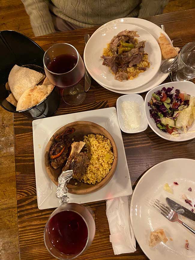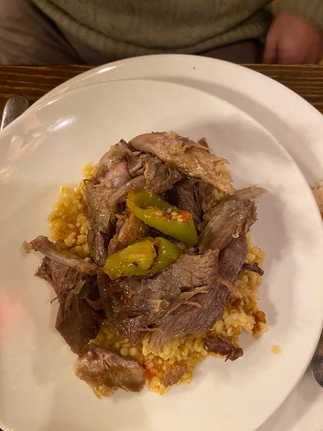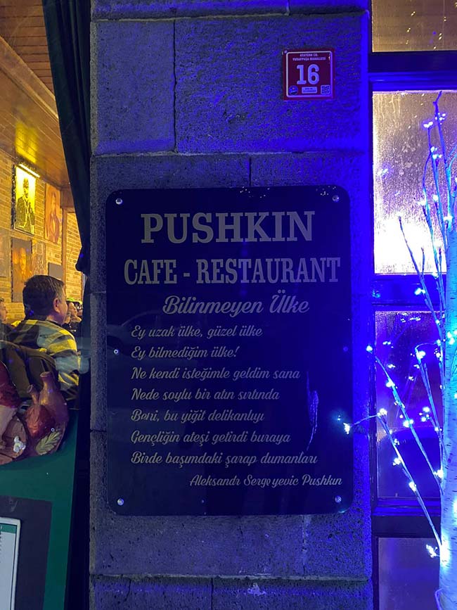 Akşam, Aleksandr Pushkin Restaurant & Cafe’nin en güzel masasına yapılmıştı yerimiz, sevgili Okan Bey tarafından. Kars’ta ne yenir derseniz, biz hepsinden yedik: Kaz eti, incik, hangel, piti ve o muazzam umaç. Restoranın sahibi Sayın Hayrettin Bey, bize oranın nasıl meydana getirildiğini detaylarıyla anlattı. Kendisi son derece dinç, çok sağlıklı; ki bunu yediği hakiki hayvansal ürünlere bağlıyor. Mekânın oluşumunda nasıl çok çalıştıklarını bizle paylaştı. Yine eski bir Rus yapısı, viran halde. Ele alıp geceli gündüzlü çalışıyorlar, ortaya bu muhteşem restoran çıkıyor. Aynı zamanda hayvancılık da yapıyorlar ve her şey kendi ürünleri. Yemekler nefis. En sondaki umaç denilen helvayı ise kazanla eve getirebilmek isterdim. Nitekim sağ olsunlar, odamız için bize epey bir yolluk yaptılar. Tereyağlı ve içinde hâlâ ne olduğunu tam bilemediğim ufak kıtırlar var. Akşamları yemekle aşık gösterileri ve Kafkas geceleri düzenleniyor. Dansçılar harika gösteriler yaptılar: Alevli, ateşli, bıçak fırlatmalı, mum ışıklı danslar…