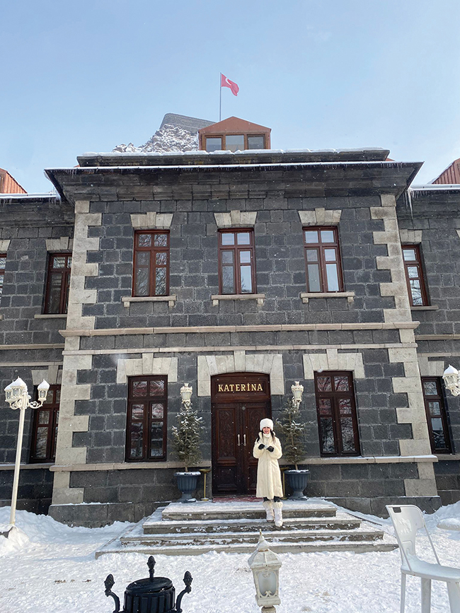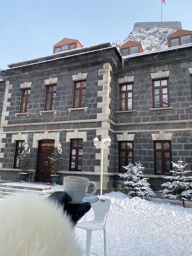Geç kalmadan otele ve yemeğe gitmek istedik. Baha Onur Erdoğdu’nun sahibi olduğu otelimiz Katerina Sarayı; Aras Nehri’nin bir kolu olan Kars Çayı’nın hemen dibinde bol ağaçlı muhteşem bir Rus yapısı. Dekorasyonu da kırmızı, bordo kadife kumaşlar, perdeler ve altın yaldızlı mobilyaları ile gerçekten bir saray. 1879 Rus işgali döneminde Çar II. Nikolay tarafından yaptırılmış. Rus işgalinden sonra cumhuriyet döneminde konak, hastane ve askerî birlik binası olarak kullanılmış. 2015 yılında Karslı iş insanı Kemal Erdoğan tarafından restore edilip butik otele dönüştürülerek Türkiye ve dünya turizmine kazandırılmış yığma taş bir saray. Akşamları Kars Çayı’nın şırıltısı ve adeta ağır çekimde yağan karın etkileyici ruhuyla, ağaçların hemen yakınında, bahçede yakılan ateşin etrafında sabahlara kadar koyu sohbetlerimiz oldu. Ortam gerçekten zamanın tüm yaşanmışlıklarını ve tüm zamanlarca söylenmiş her repliği ve her duygu partikülünü adeta yağan karla bu mekâna nakşetmiş. Siz oradayken tüm bu enerjilerin güçlü haşmetini hissediyorsunuz. Geceleri hiç uyumadık gibi; birkaç gündü saraydaki bu günlerimiz.